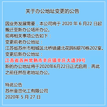 蘇州金忠化工有限公司成立于1995年元月,位于人杰地靈、山清水秀的蘇州市相城區(qū)。而生產(chǎn)工廠則位于國家級化工園區(qū)-蘇州常熟市新材料產(chǎn)業(yè)園區(qū)。 園區(qū)水、電、汽設備配套齊全。生產(chǎn)工廠占地面積70,000m2,擁有標準廠房50,000m2,2002年通過了ISO9001國際質(zhì)量體系認證。